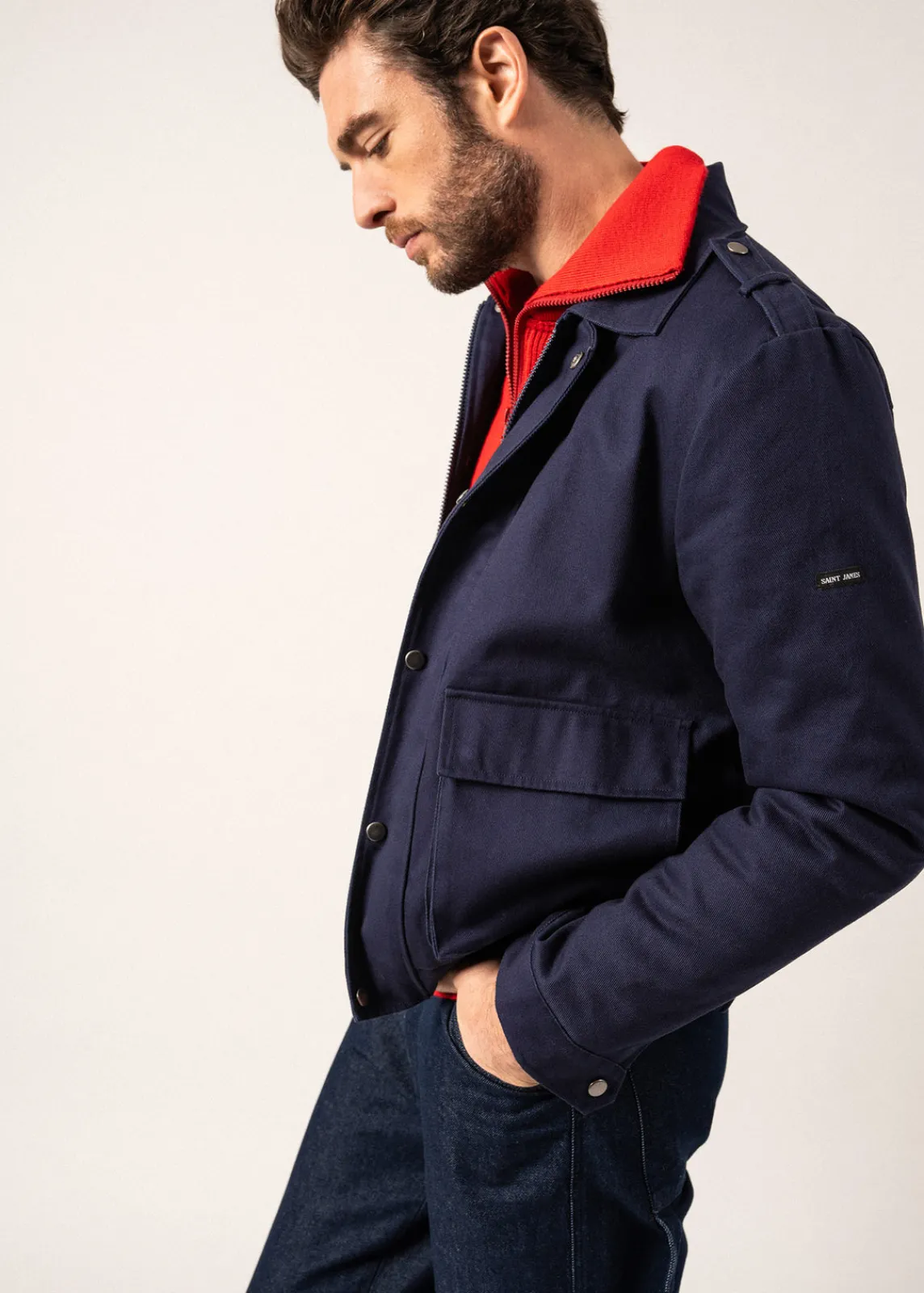 Le blouson St Richard est un blouson de mi-saison, fabriqué en coton. On aime ses grandes poches plaquées sur le devant du modèle, ainsi que sa fermeture par zip et boutons pression contrastés, modernes. – Blouson en twill