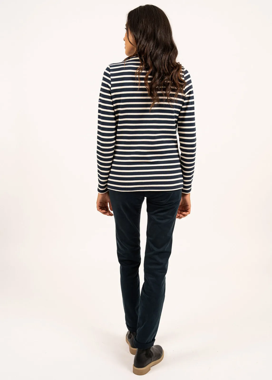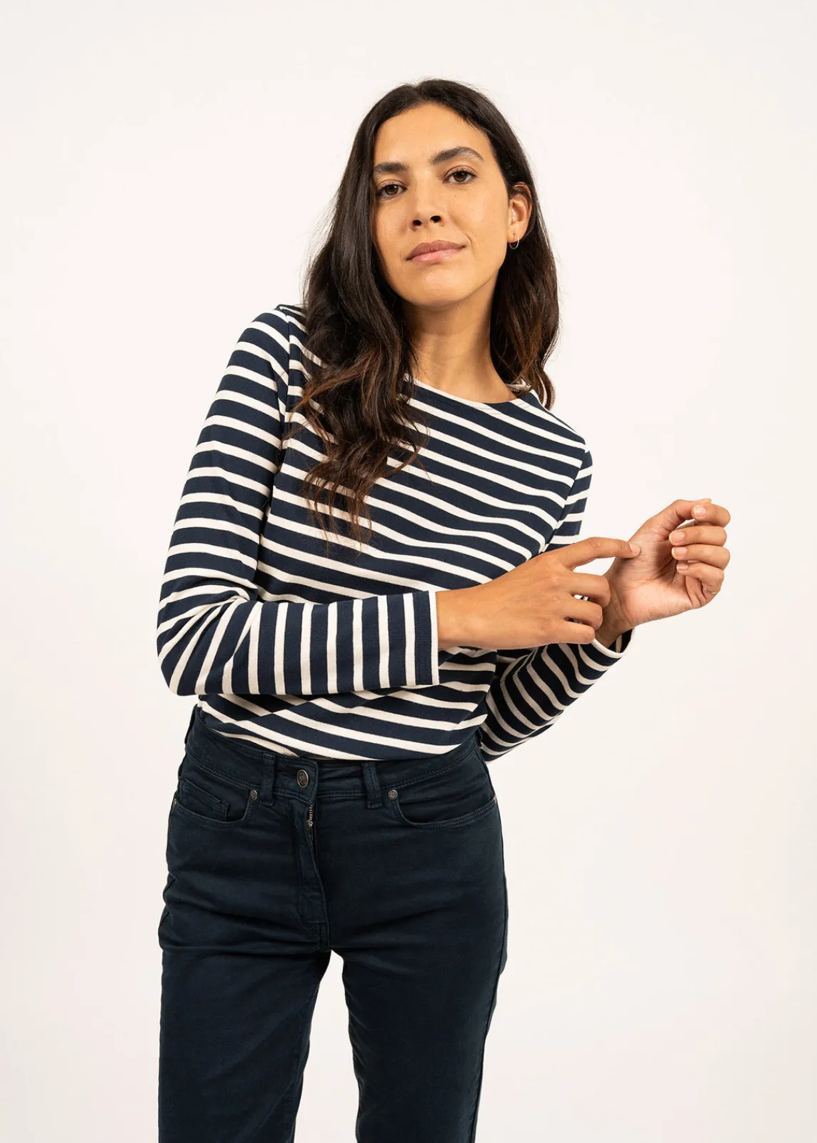 Avec sa matière authentique en coton cardé, la marinière Méridame est plus épaisse et plus rustique que notre iconique Minquidame, en coton léger. Version féminine de notre Méridien, sa coupe est adaptée aux morphologies féminines avec une taille légèrement marquée, et un bas de corps évasé. Une pièce chic et confortable, idéale pour les inter-saisons ou en hiver sous une jolie veste en laine.