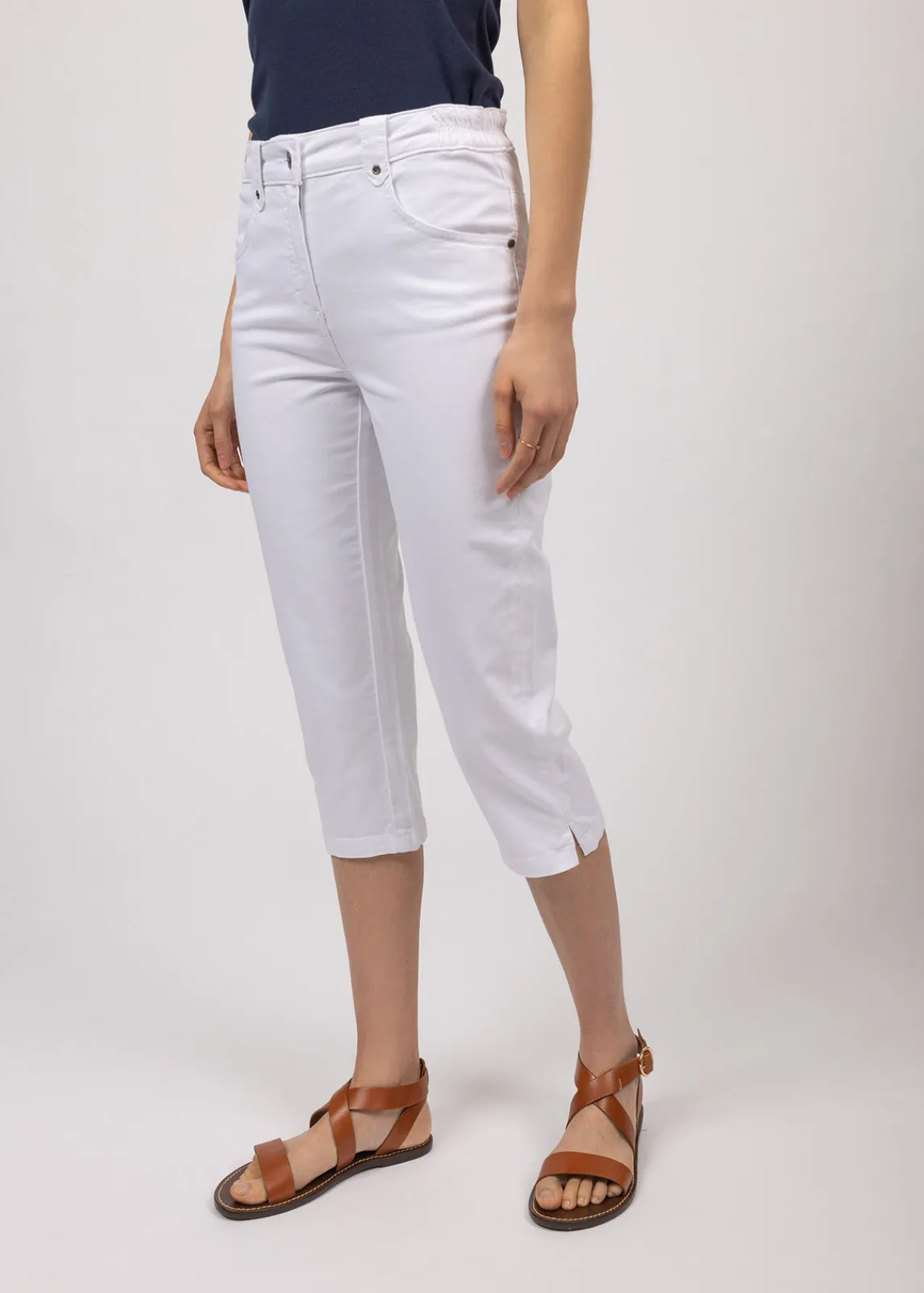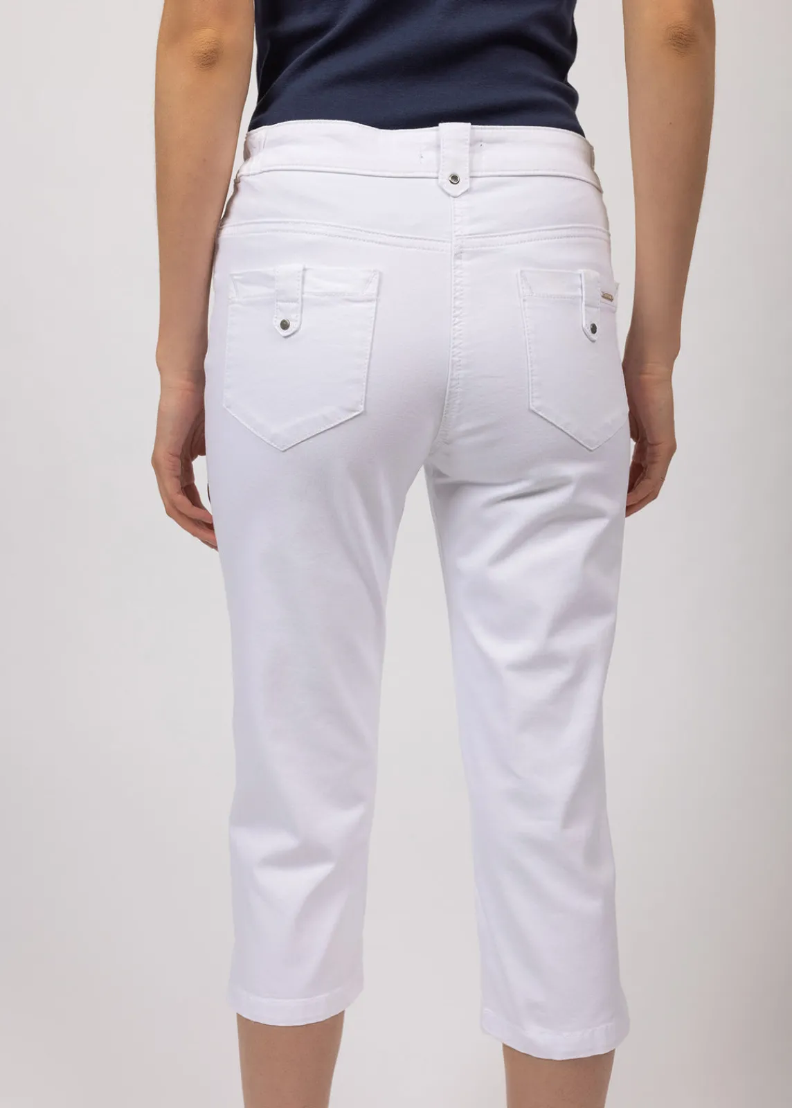 Pantacourt en gabardine. Poches cavalières et poches plaquées au dos. Ceinture élastiquée sur les côtés. Pattes décoratives sur les poches au dos. Œillets en décor. Fente en bas de jambes. Bouton en métal gravé ancre.