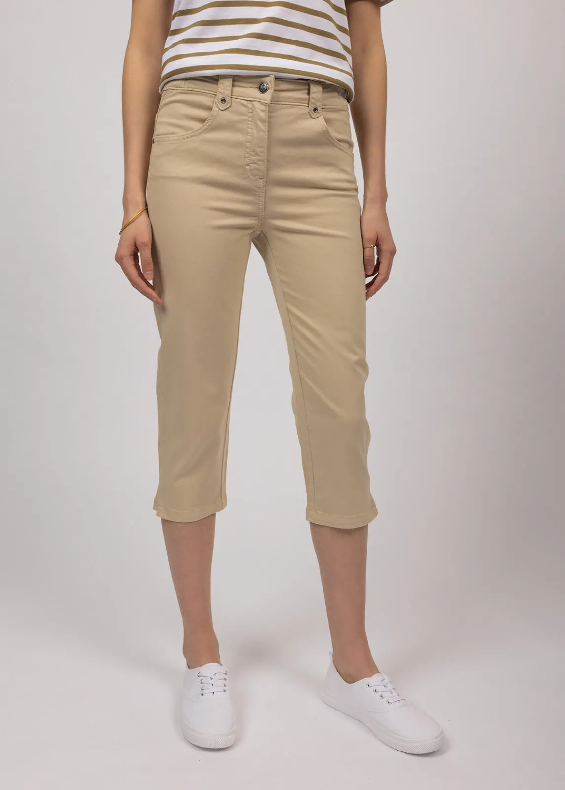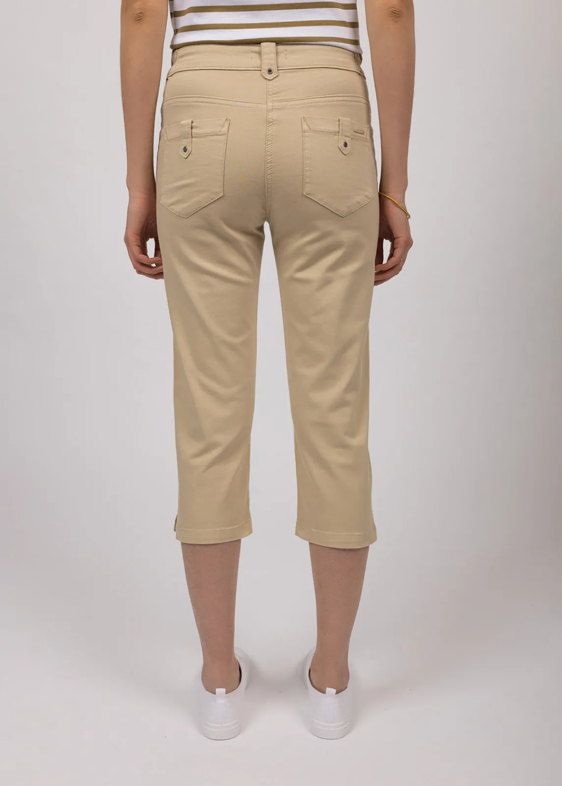 Pantacourt en gabardine. Poches cavalières et poches plaquées au dos. Ceinture élastiquée sur les côtés. Pattes décoratives sur les poches au dos. Œillets en décor. Fente en bas de jambes. Bouton en métal gravé ancre.
