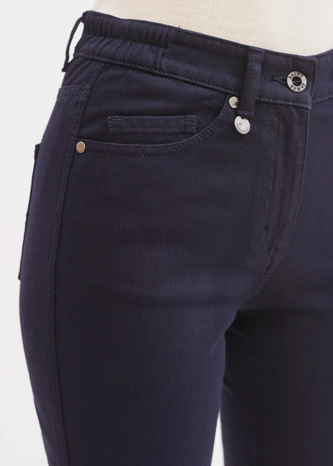 Le pantalon Patricia présente un atout majeur : le confort. Outre la ceinture élastiquée sur les côtés, il est confectionné dans une matière qui s’approche du jean dans sa robustesse alors qu’elle est tricotée. Visuellement, on ne le devine pas mais la maille permet à la matière de s’étirer dans la hauteur comme dans la largeur, et grâce à sa part d’élasthanne, épouser au mieux les courbes du corps.
