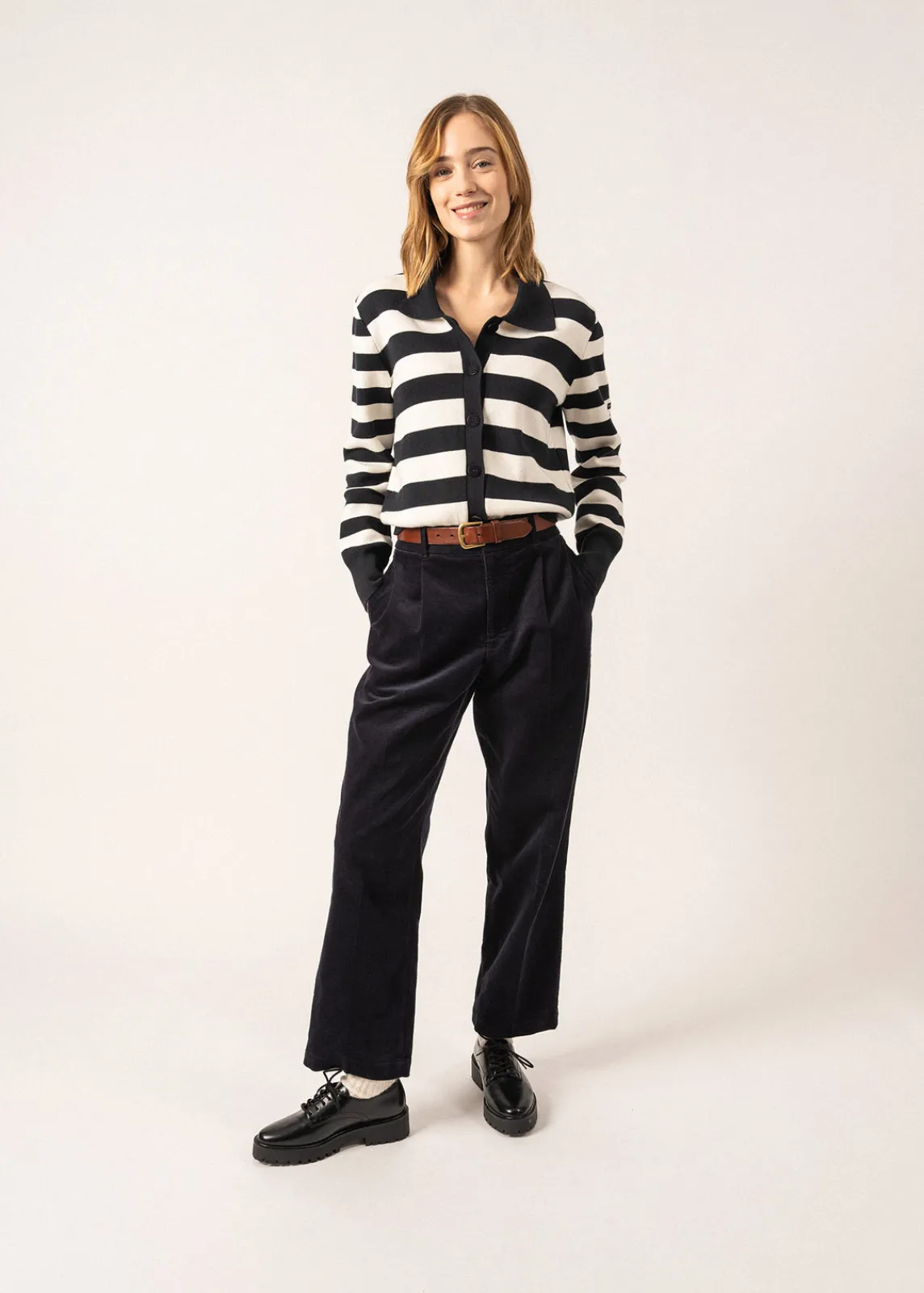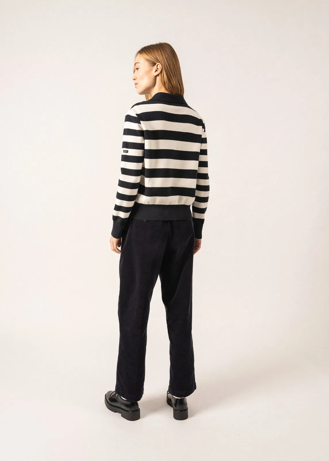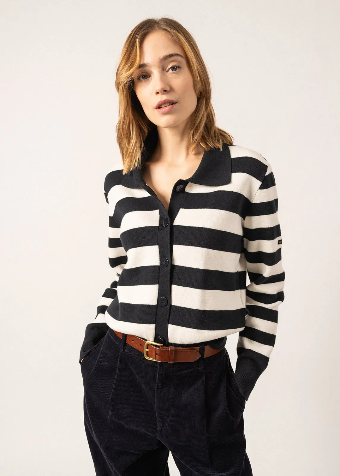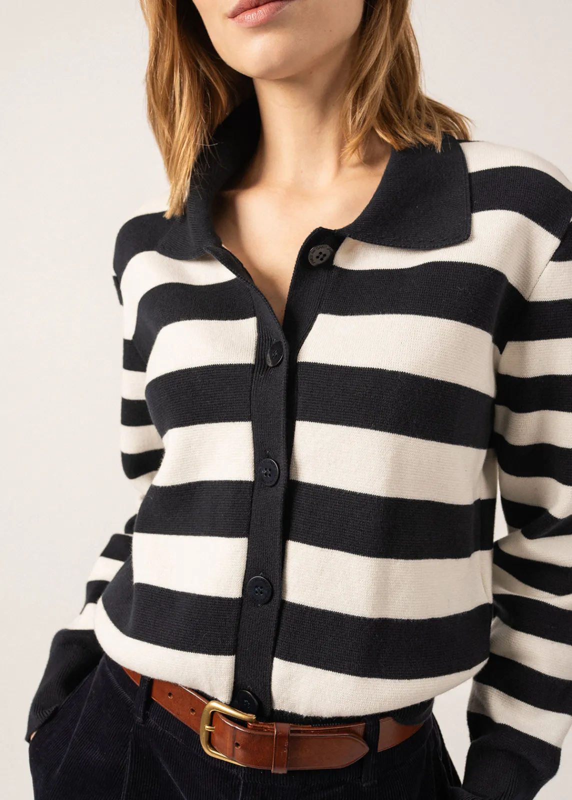 Tricoté en point de Rome, le gilet Galway présente élégance et tenue. On aime son jeu de rayures, plus larges sur le corps, rappelant notre héritage marine. Confectionné dans un mélange de coton et de cachemire, il est à la fois léger, doux et confortable.- Gilet rayé