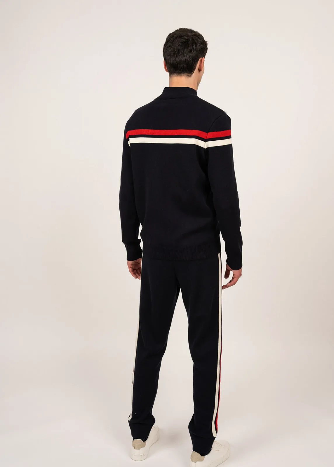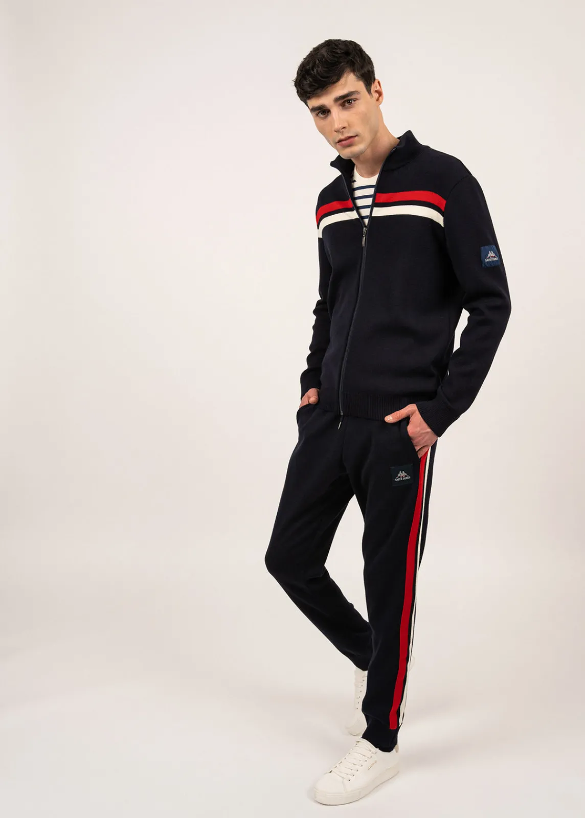 Le gilet Conquérants, tricoté en laine, est un gilet zippé, à col montant. Sur le devant, deux bandes blanches et rouges reprennent les couleurs de l’équipe.
