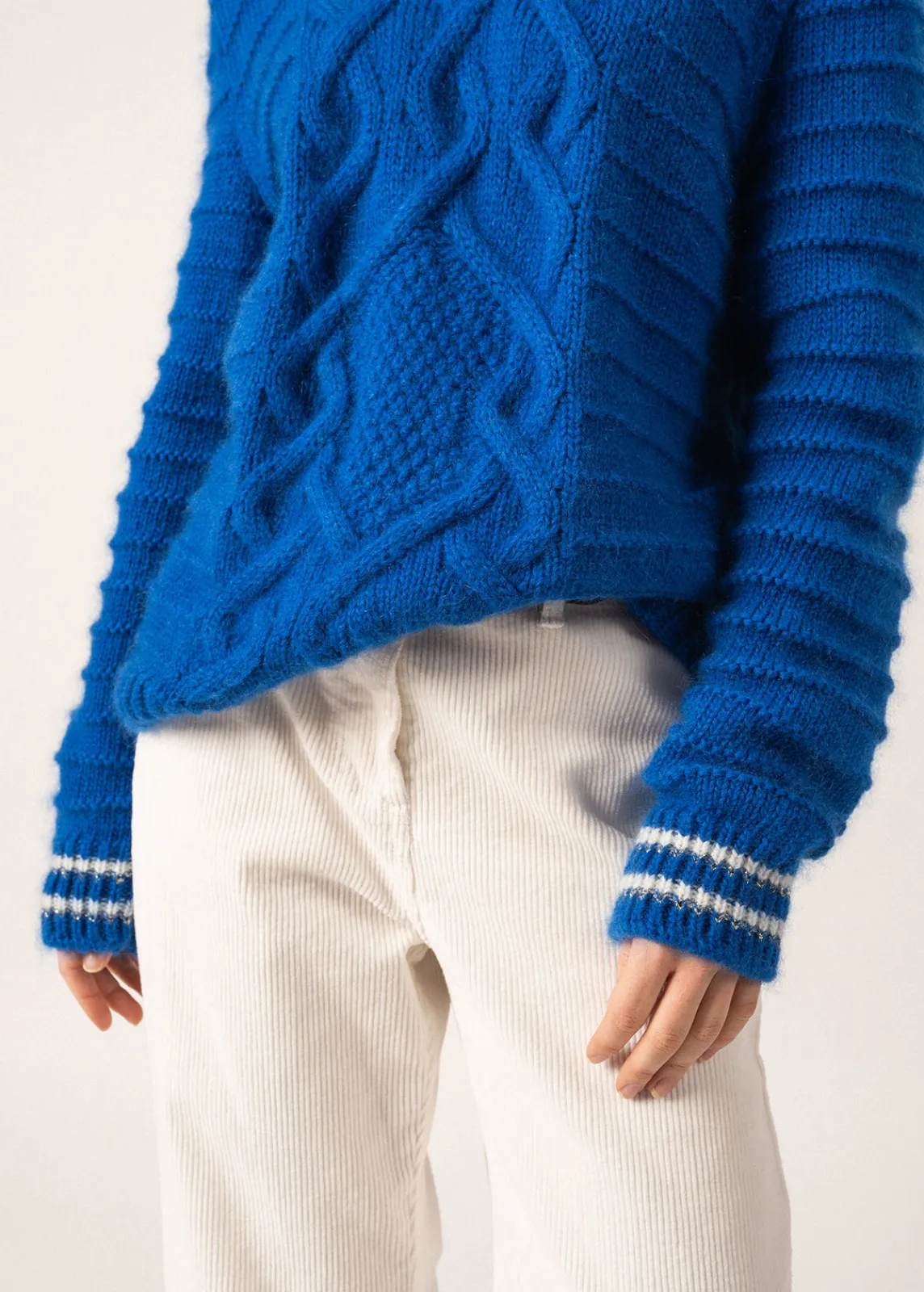 Tricoté dans nos Ateliers à Saint-James, le pull Alpes est un pull en mohair mélangée, à l’aspect duveteux. On aime ses larges torsades sur le corps du pull, ainsi que le détail de ses rayures colorées en bas de manche.- Pull