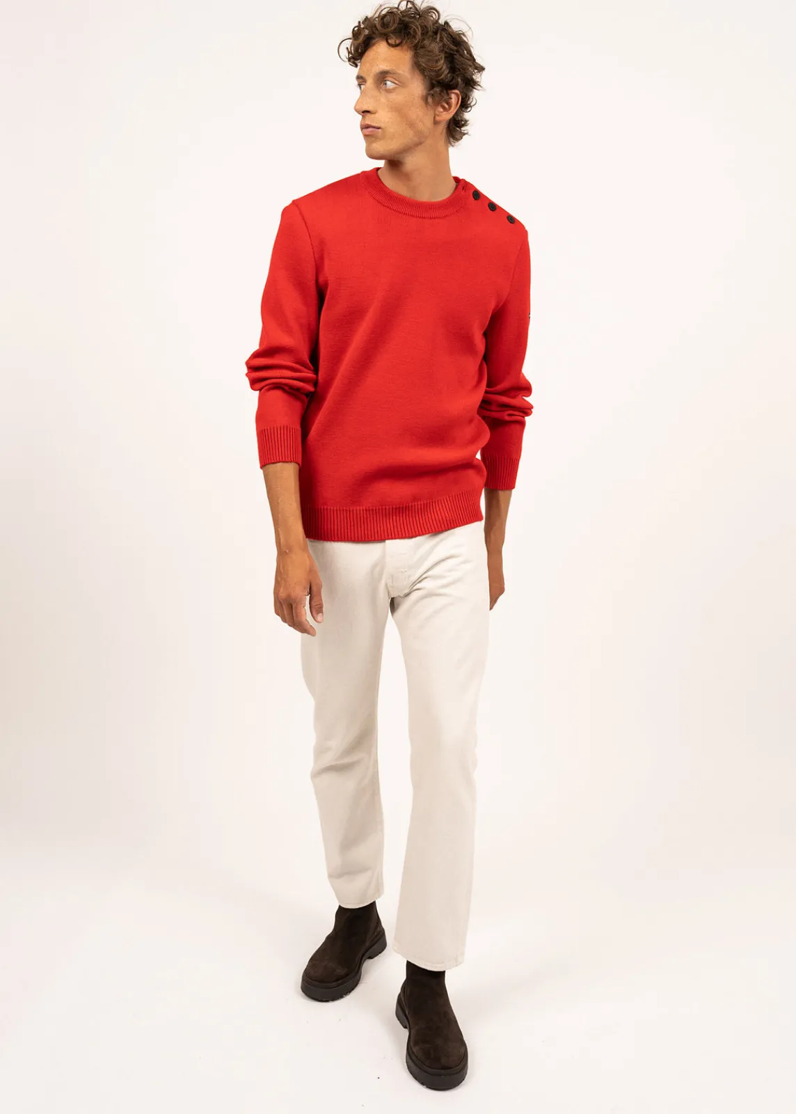 Avec le modèle Cancale, le pull marin normalement près du corps se fait plus confortable. Grâce à son bord-côtes en bas de vêtement, le volume est travaillé pour gagner en amplitude et habiller les différentes morphologies.