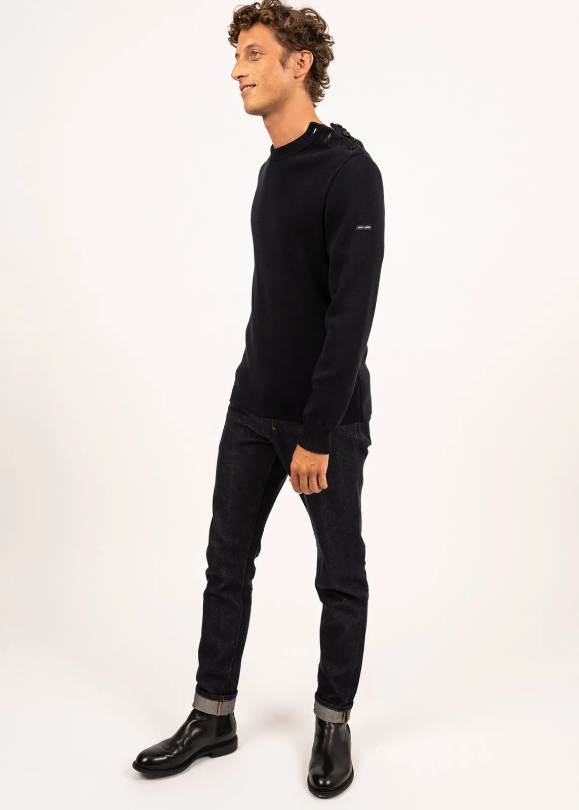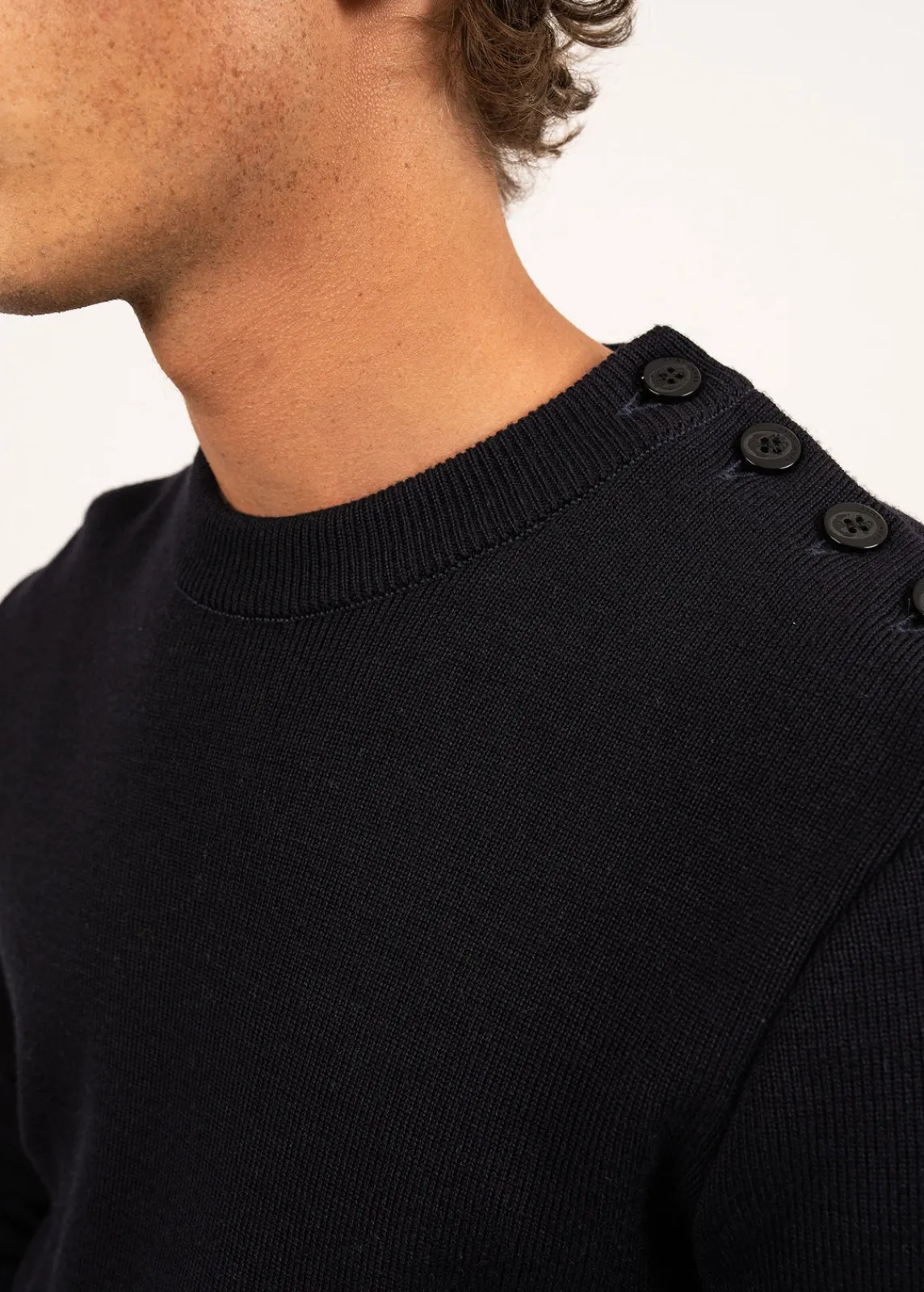 Pour ce pull à l’allure marine, la laine se mélange à de l’acrylique teflonée, ce qui améliore sa technicité : cette caractéristique facilite son entretien et agit comme un hydrophobe et rend la laine moins absorbante, un atout pour faire face aux caprices de la météo avec quiétude.
