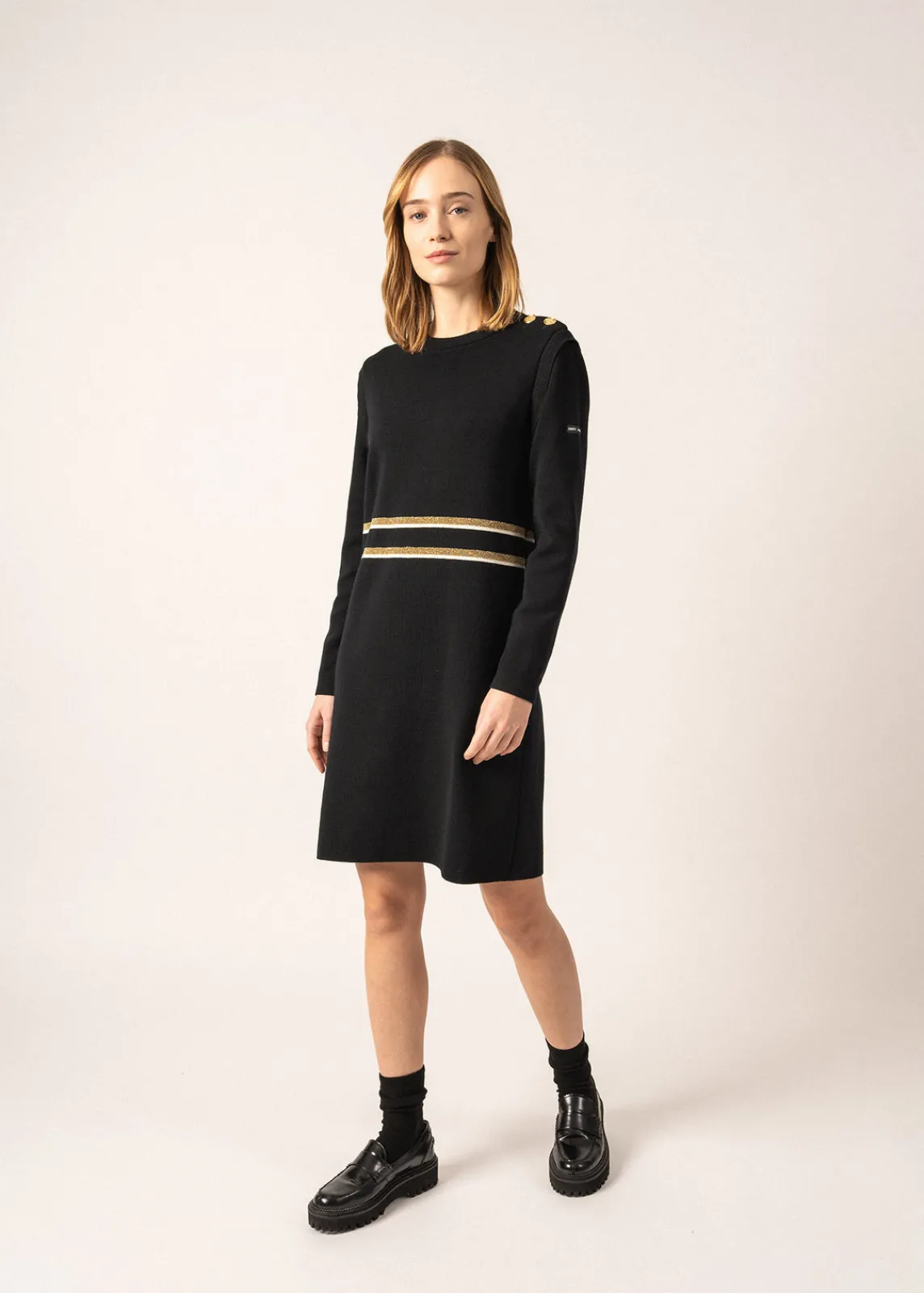 Idéale pour les fêtes de fin d’année, la robe Party est une robe en laine, avec à la ceinture deux bandes en lurex champagne. Celles-ci apportent une touche de lumière et de fantaisie à ce modèle au design épuré, caractéristique du style SAINT JAMES.