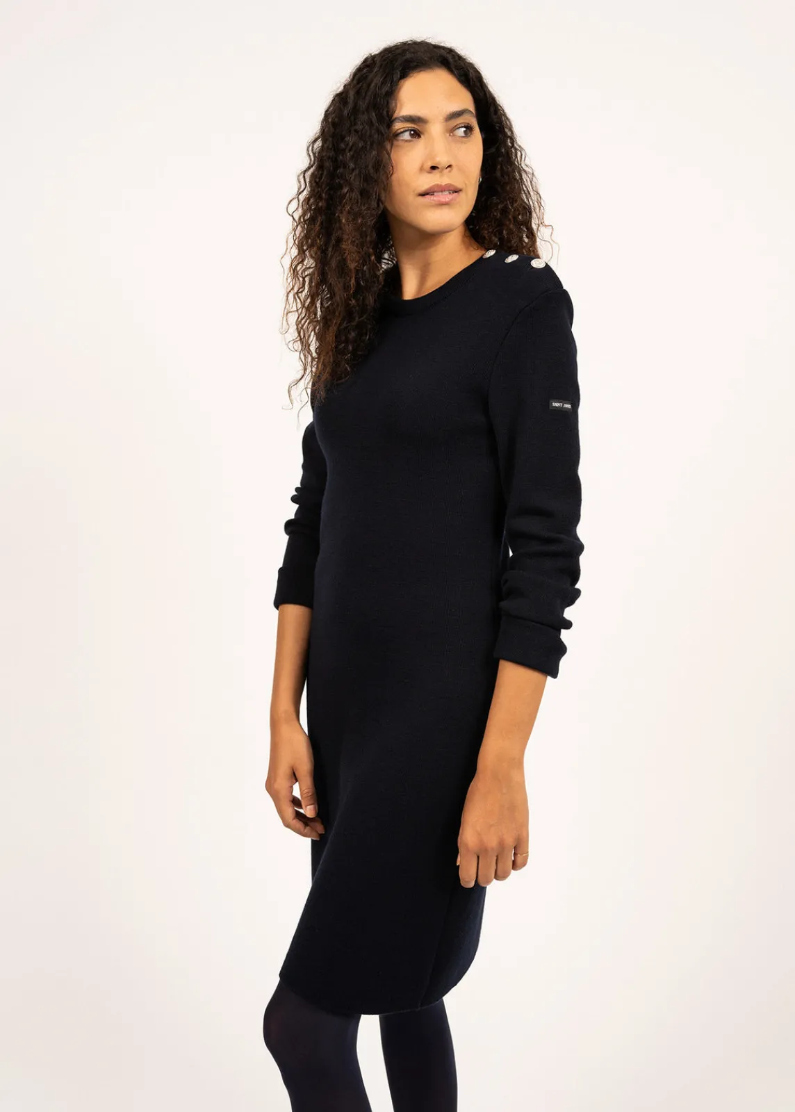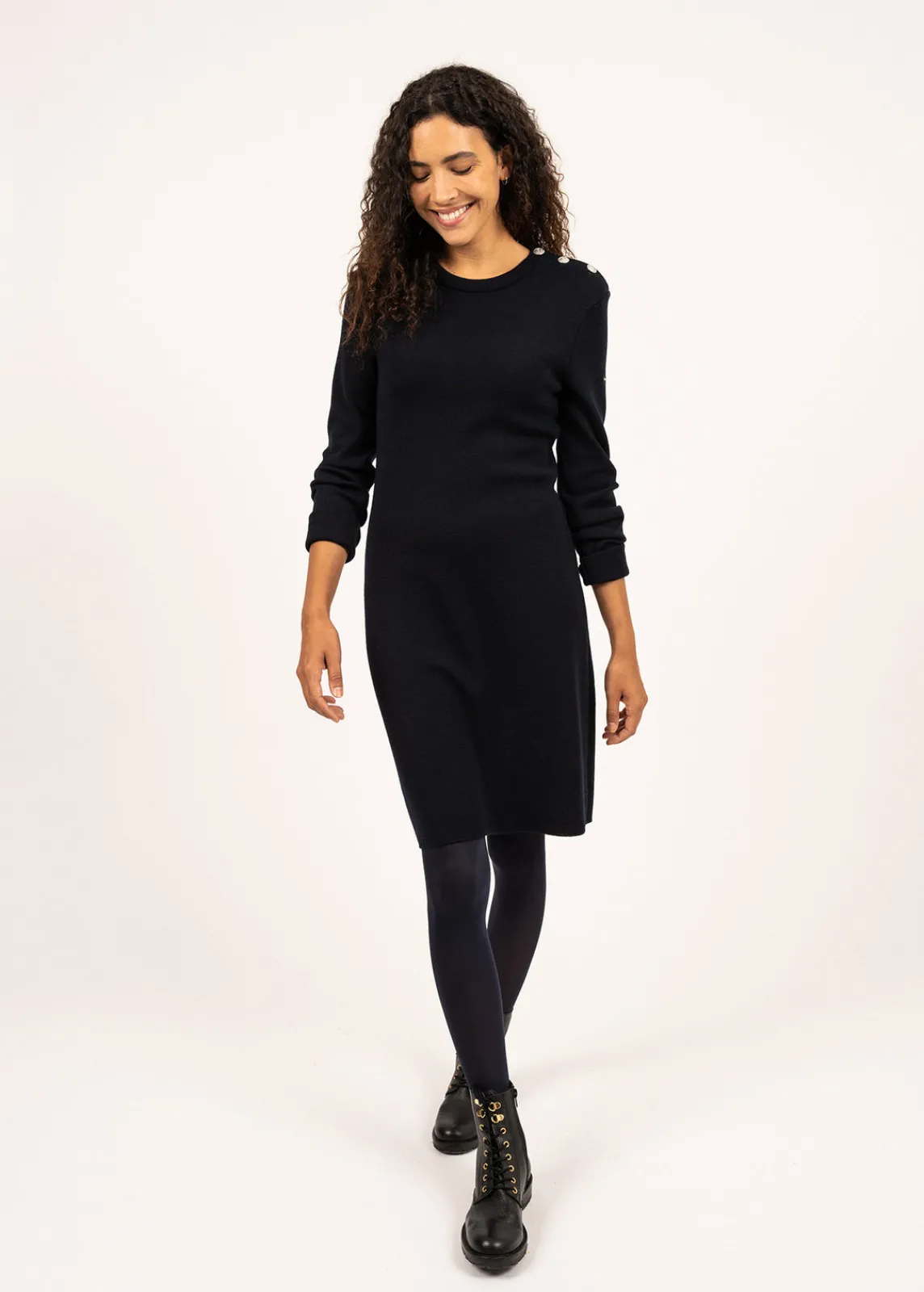 Tricotée dans nos ateliers, la robe Grande Marée unie en laine de mérinos s’inspire du célèbre pull marin SAINT JAMES. Un classique élégant réinventé pour une silhouette féminine marine.