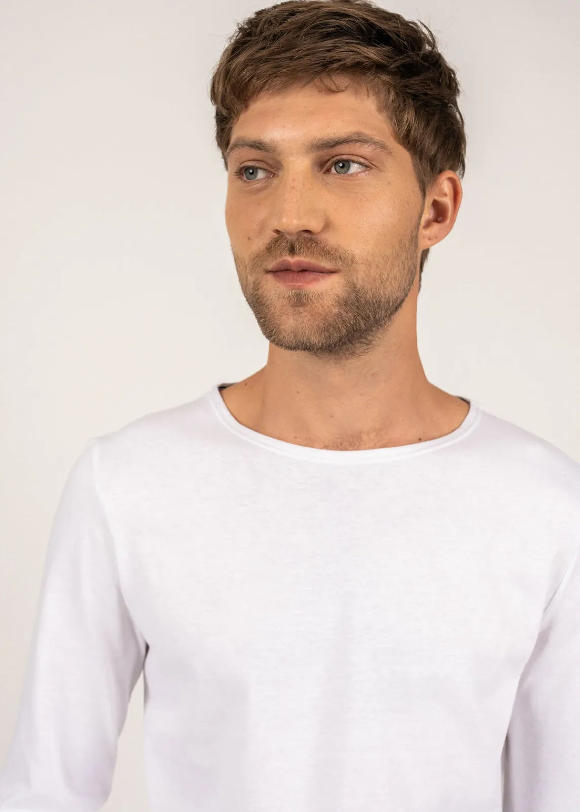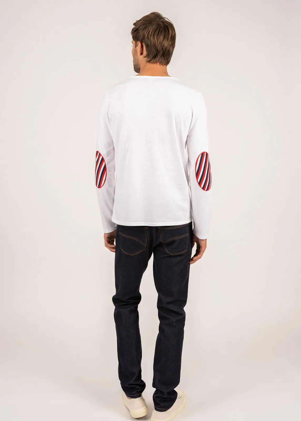 Simple et confortable, ce t-shirt est un t-shirt à manches longues, confectionné en coton dans nos Ateliers normands. Aux manches, un détail de coudières rayées reprenant les couleurs de la République Française ajoute une discrète touche de fantaisie à ce modèle basique, indispensable.-Marinière