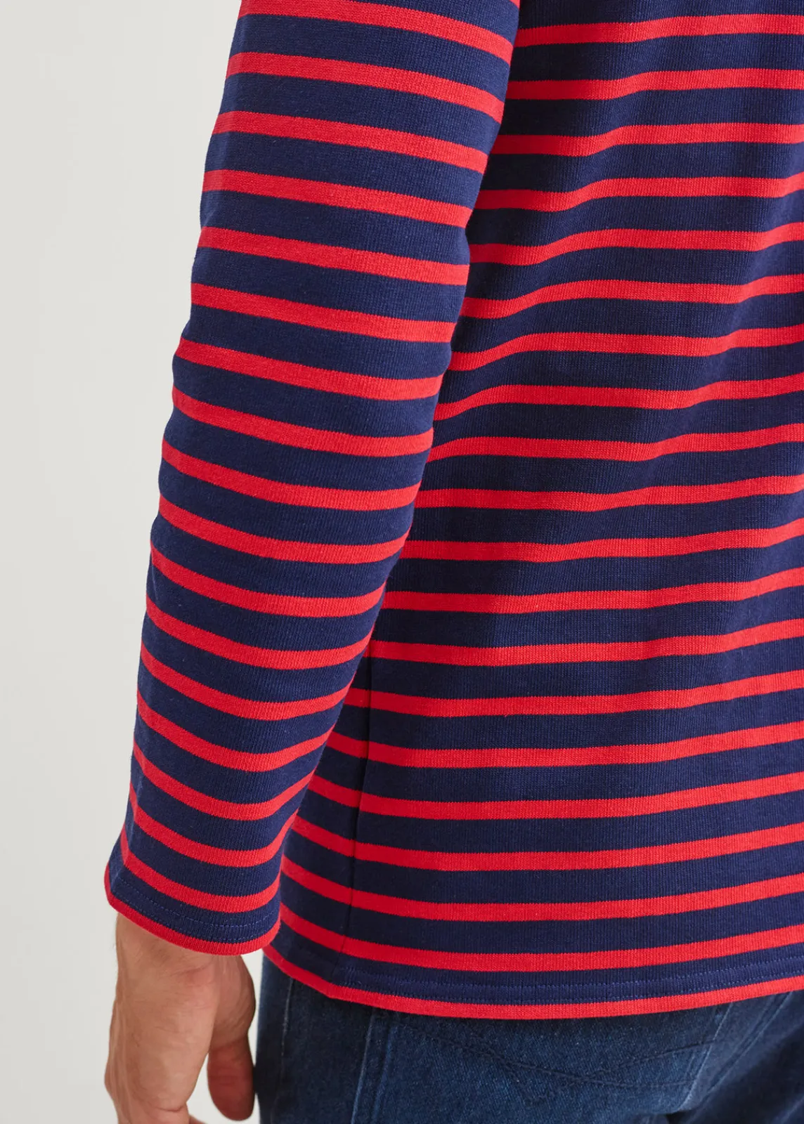La marinière Guildo présente un aspect légèrement rustique du au coton cardé, la forme « carré » du corps reprend l’idée du volume élémentaire de la marinière, l’encolure bateau finalise le vêtement traditionnel.