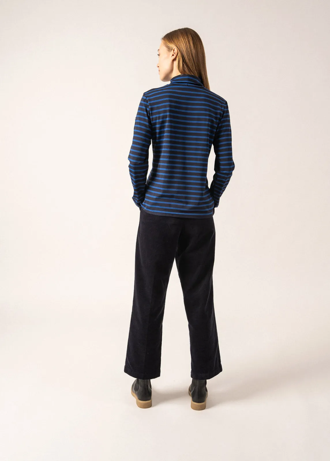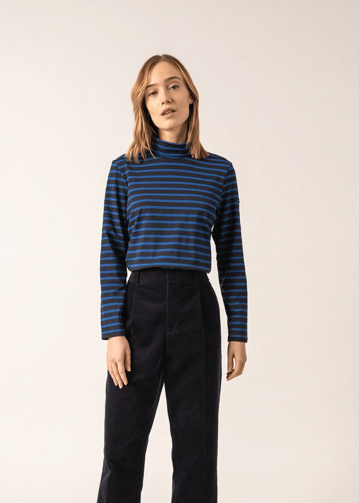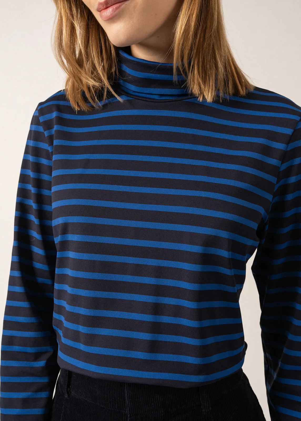Confectionné dans nos ateliers, le t-shirt à col roulé Oural est un t-shirt en jersey rayé esprit sous pull. Fabriqué en Uvyl, un mélange de polyamide et d’élasthanne, il est confortable et stretch.