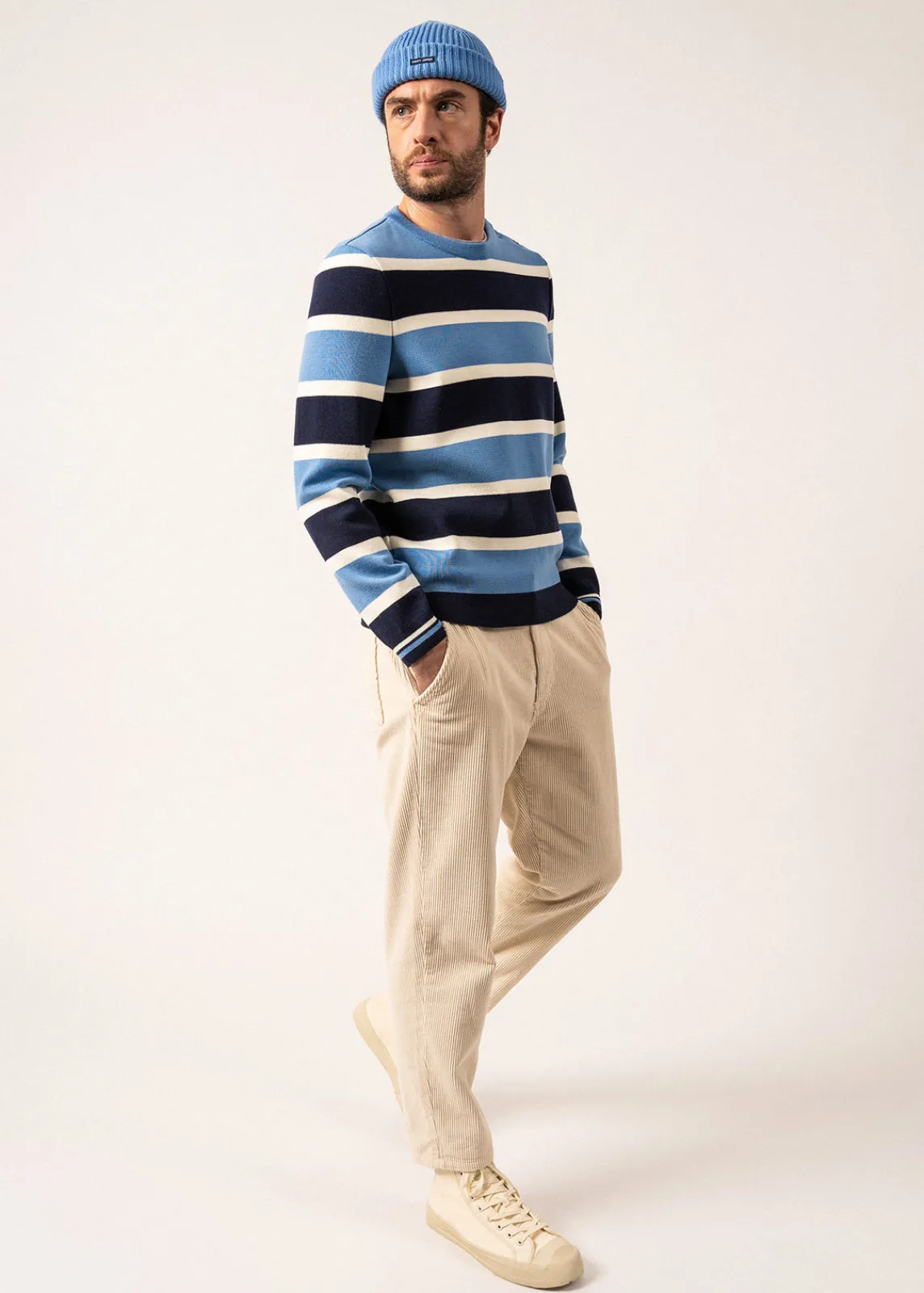 Avec ses rayures esprit rugby, le Cancale s’offre une nouvelle déclinaison, fraiche et colorée. Confectionné cette fois dans une laine plus douce, celle de notre iconique Marée, il est agréable et chaud. En bas de corps, un bord-côte lui apporte volume et confort.- Pull