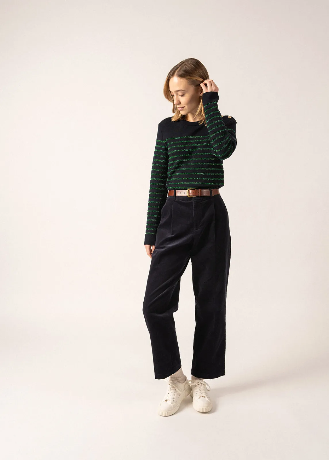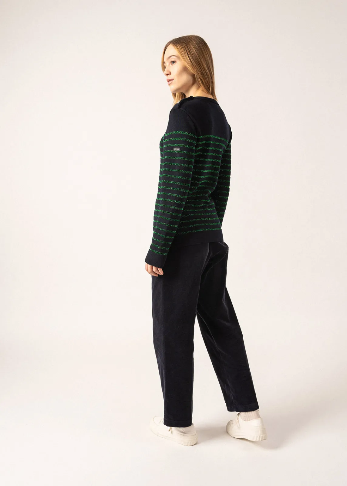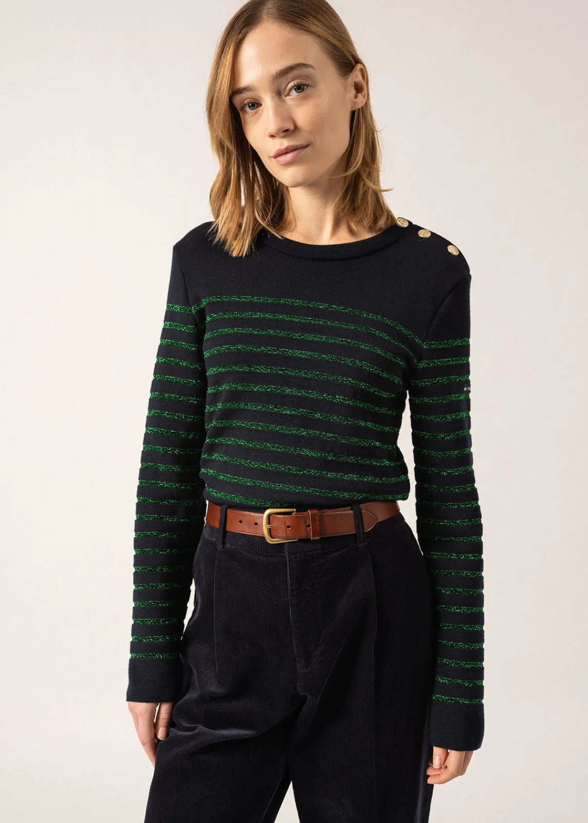 Pièce incontournable du vestiaire féminin SAINT JAMES, le pull Marée est une version féminine de notre iconique pull marin. Tricoté dans nos Ateliers dans une laine douce et fine, il est parfait pour celles cherchant à allier confort, chaleur et élégance. Intemporel, il reprend les codes centenaires de nos pulls marins : un col rond remaillé, un tricotage en côte 1×1, un boutonnage à l’épaule, une composition 100% laine vierge et une coupe près du corps, pour conserver chaleur et praticité. Décliné dans une version lurex, il est parfait pour les fêtes de fin d’année, ou simplement pour ajouter une touche d’originalité dans votre quotidien.