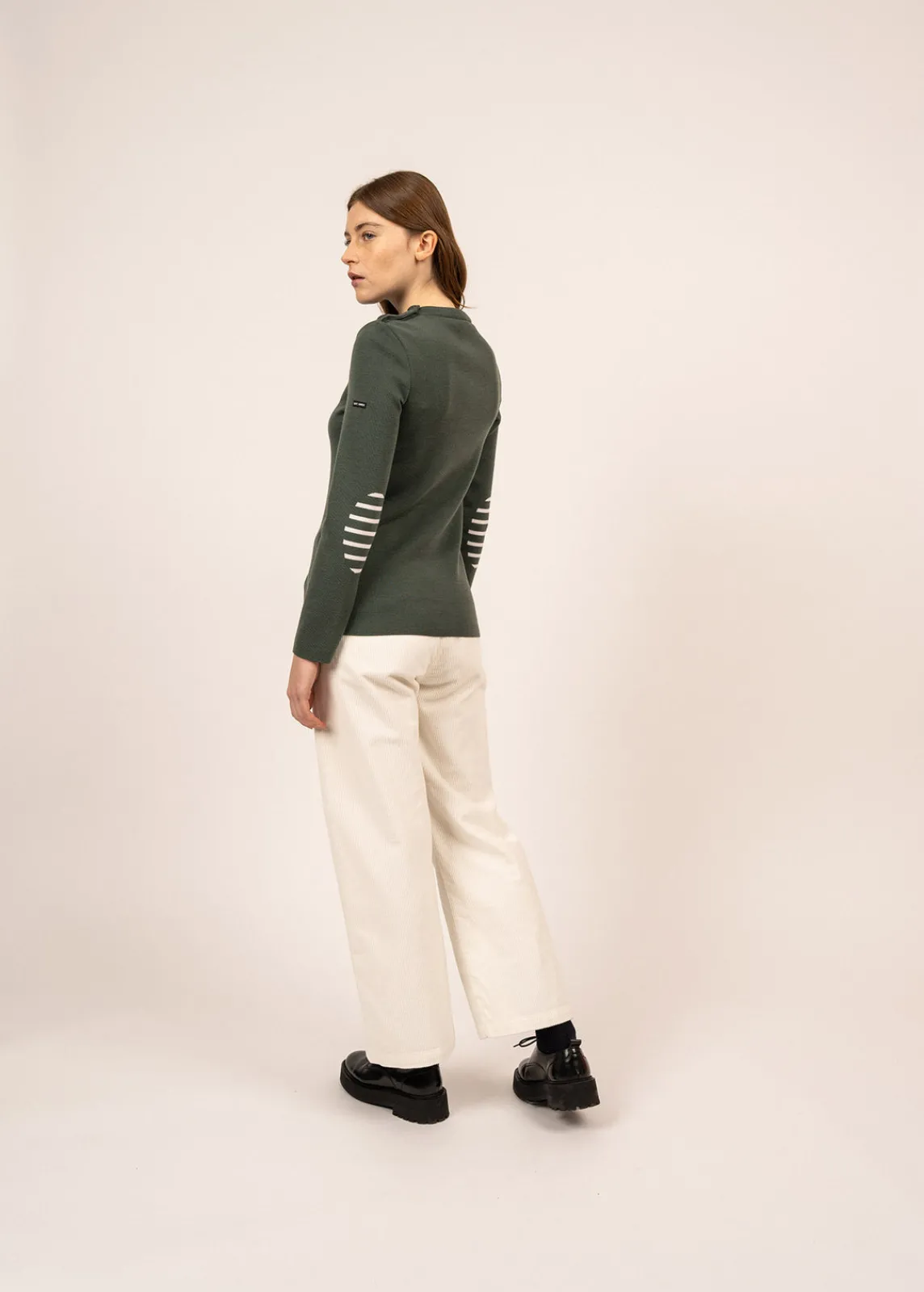 Inspiré de notre héritage marin, le pull en laine Brégançon est un incontournable du vestiaire SAINT JAMES. Tricoté dans nos Ateliers à Saint-James, sa coupe droite et sa composition 100% laine en font une pièce confortable, idéale pour celles cherchant un pull marin moins près du corps que notre traditionnel Marée. Ses coudières et son bouton en forme de marinière lui apportent une discrète touche d’originalité, pour un style marin revisité.