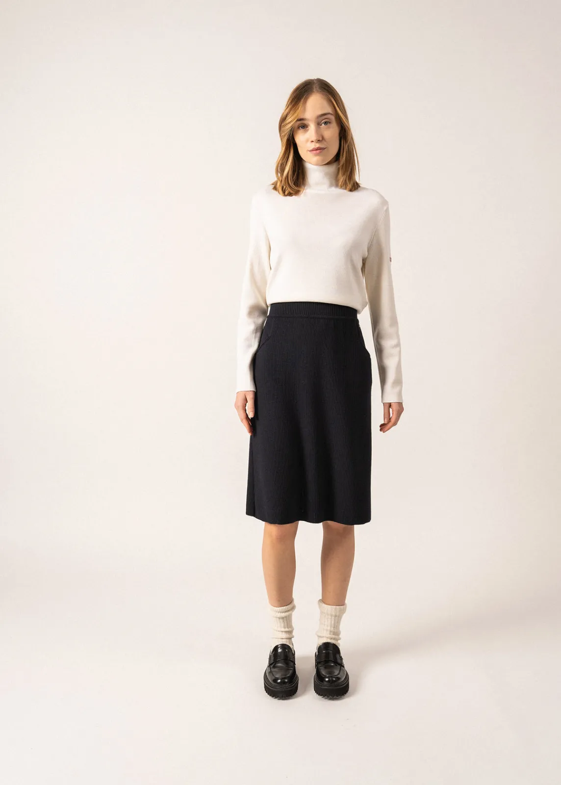 Elégante, la jupe Artigues est une jupe en laine, à la coupe droite. Confectionnée dans nos Ateliers, c’est une pièce idéale pour l’hiver, chaude, confortable et douce. On aime l’associer à un basique pull Navy pour un effet robe, ou un chemisier blanc et un gilet pour un style plus formel.- Jupe droite en maille