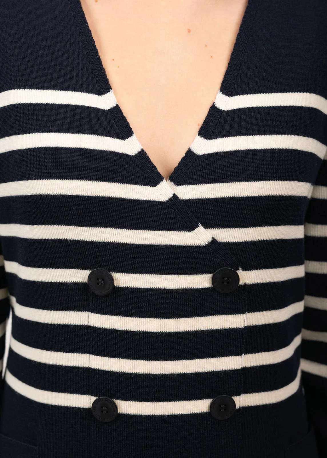 Elégante, la robe en laine Royale est une pièce chic, inspirée de notre univers marin. On aime sa coupe flatteuse, grâce à son col V, ainsi que ses rayures placées. Son double boutonnage et ses poches rappellent les détails de nos iconiques cabans. Une pièce féminine, qui célèbre notre savoir-faire et notre héritage marin.- Côte 1×1